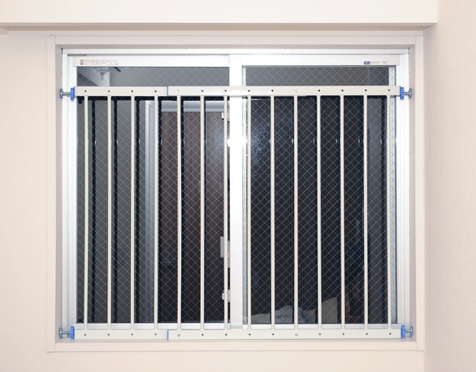 完成イメージはこちらです。例え窓を開けられたとしても2枚の柵を取り付けておりますので、落下を防止することが出来ます。両端の青いナットを回してゴムの部分を窓枠に密着させて突っ張らせることで固定できます。最後にしっかり固定さているか確認してください。