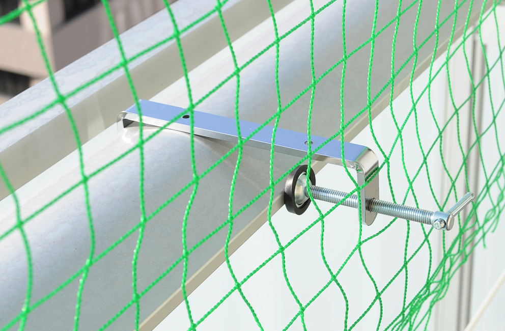 完成イメージはこちらです。ベランダのフェンスに対して突っ張り棒を縦に取り付け、ベランダと突っ張り棒の交差部を「クランプ」で固定します。ここで重要なのは、突っ張り棒を揺さぶっても、固定できていることです。その後にネットを張って端を結束バンドで固めて完成です。